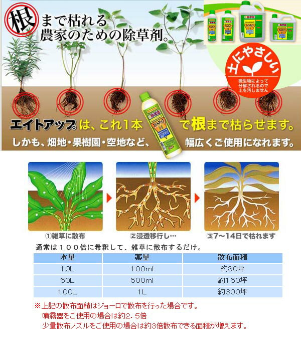 品名 エイトアップ 規格 5L 成分 グリホサーとイソプロピルアミン塩、(イソプロピルアンモニウム=N [ホスホノメチル]グリシナート)、水・界面活性剤等 JAN 4544266000030(1) 殺草作用は非選択性です 本剤の殺草作用は非選択性ですからイネ科、広葉雑草を問わず一年生雑草から多年生雑草、ササ類、雑潅木に至るまでほとんどの雑草木に確実な除草効果を発揮します。
