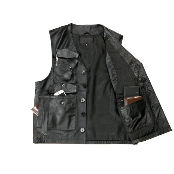 【送料無料】【Adfreek ラム革10ポケットベスト】 レザーベスト メンズベスト 革ベスト 羊革 男性用 ブラック 黒 春用 秋用 レザーウェア 袖なし ダンディに決まる