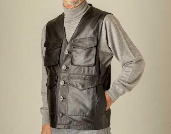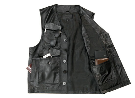 Adfreek ラム革10ポケットベスト ダンディに決まるレザーベスト 日本のデザインチームによる軽量設計の多機能ラム革10ポケットベストです。