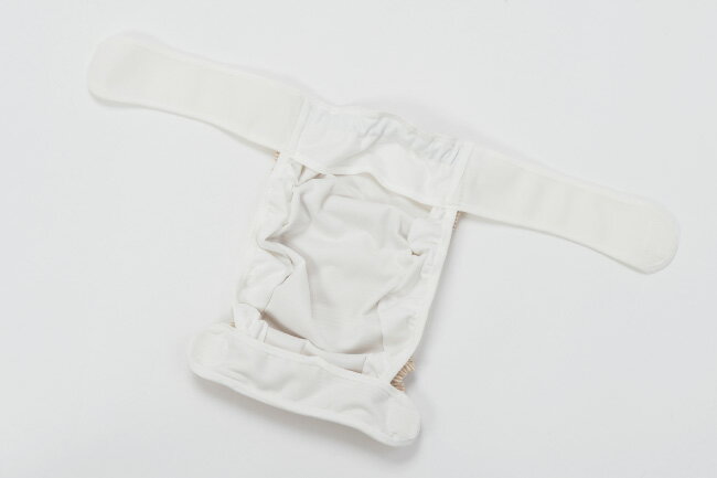 ■布おむつ収納ポケット付き 前、後ろ腰部分に布おむつの上下の端をすっぽり収められる ポケットが付いています。