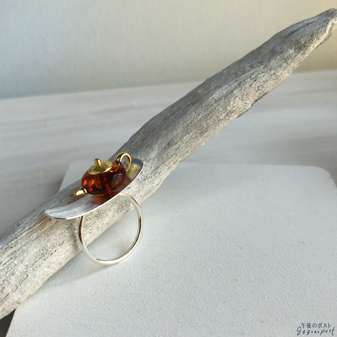 《送料無料》シルバー925 琥珀 ブラウンティーポット フリーサイズリング 個性派デザイン お茶会 天然石 オープンリング レディース 指輪