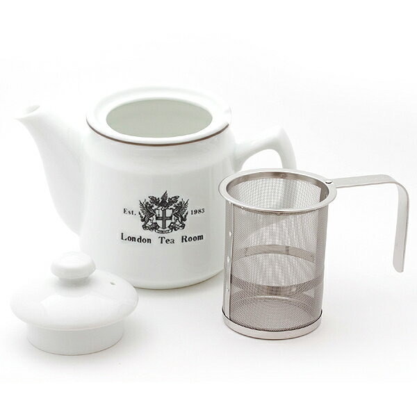 【セット内容】 特許取得茶漉し付きロンドンティールーム陶器製ティーポット (オリジナルロゴ入り) ・茶葉2種 50g(缶入り) ●オレンジペコーティー ●ヴィクトリアティー ・ティーキャディースプーン付属 <特許取得茶こし付き陶器製ティーポットの商品説明> ・特許第4476316号にて登録 ・サイズ:直径110mm(底)、手持ち部分まで180mm、高さ130mm ・容量:約600ml ・材質:本体及び蓋=陶器、茶漉し=ステンレス製 ・製造:日本製 <特許取得茶漉し付き陶器製ティーポットの特徴> ・紅茶専門店ならではの視点から開発した茶漉し付きティーポットです。