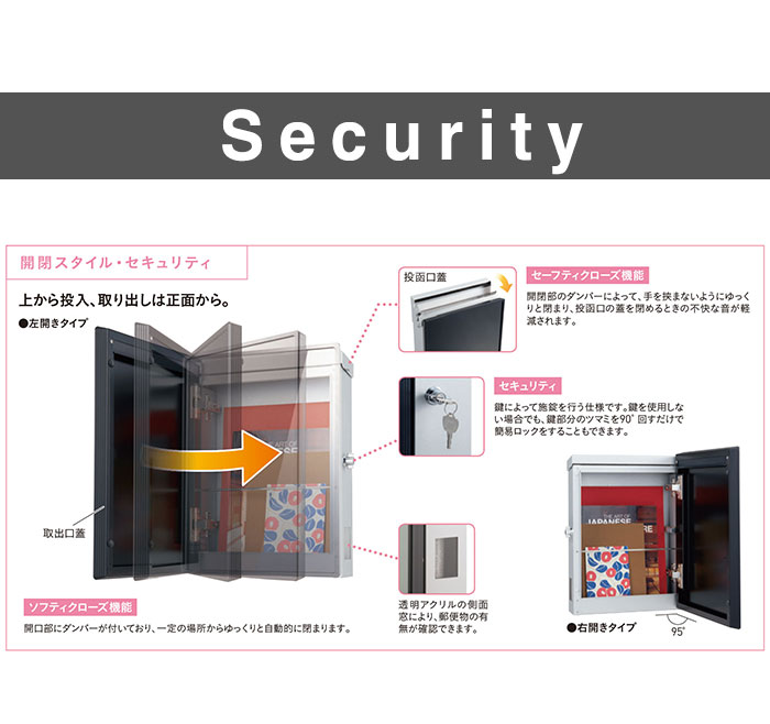 漆器を思わせる上品な艶姿形に無駄がなく、美しさと実用性を兼ね備えたポスト強化ガラスにより漆器を思わせる上品な重箱を再現し、シンプルなフォルムの中にも洗練されたデザインを取り入れました▼仕様上から投入、取り出しは正面から▼特徴取出口蓋の開口部にダンパーがついており、一定の場所からはゆっくりと自動的に閉まります開閉部のダンパーによって、手を挟まないようにゆっくりと閉まり、投函口のふたを閉める時の不快な音が軽減されますシリンダー錠タイプです鍵部分のつまみを90°回すだけで簡易ロックをすることもできます▼サイズ[扉を閉じた状態]W328×H437×D120(mm)[扉を開けた状態]W358×H480×D418(mm)▼材質[本体]ZAM[取出口蓋]強化ガラス、ASA樹脂 ▼重量5.3 ▼付属品取付スペーサー【商品配送時の注意点】こちらの商品は配送日時の指定ができません。
