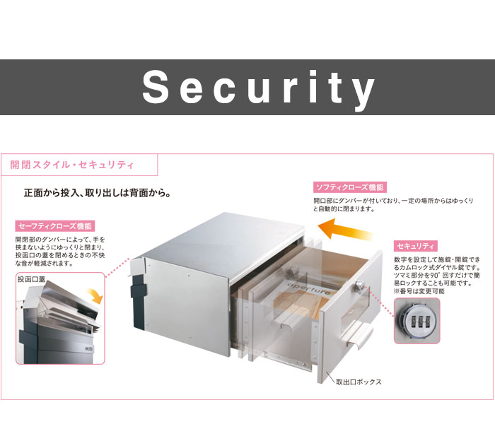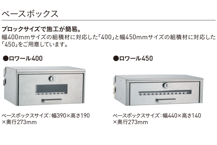 高級感漂うシャープな表情と機能性の融合取出口ボックスを引き出して、上から郵便物を取り出せるので、大切な郵便物を折り曲げることなくスムーズに取り出せますシャープで品のある表情と落ち着いたカラーが高級感を感じさせます▼仕様正面から投入、取り出しは背面から▼特徴開閉部のダンパーによって、手を挟まないようにゆっくりと閉まり、投函口蓋を閉める時の不快な音が軽減されます取出口ボックスの開口部にダンパーが付いており、一定の場所からはゆっくりと自動的に閉まります数字を設定して施錠・開錠ができるカムロック式ダイヤル錠ですツマミ部分を90°回すだけで簡易ロックすることも可能です※番号は変更可能▼注意点ポスト前面部、本体部底面の水抜き穴をふさがないでくださいポスト上面のブロック積みは3段までとしてください水平に施工して下さいポストの変形、故障の原因になります郵便物が過度に多い場合や重量物の場合に取出口蓋が開いてしまう場合があります▼サイズ・ロワール400[閉じたとき]W390×H190×D311(mm)[開いたとき]W390×H212×D525(mm)[投入口]W347×H30・D30(有効寸法41)(mm)・ロワール450[閉じたとき]W440×H162×D311(mm)[開いたとき]W440×H162×D525(mm)[投入口]W397×H30・D30(有効寸法41)(mm)▼材質ステンレス ▼重量6.8【商品配送時の注意点】こちらの商品は配送日時の指定ができません。