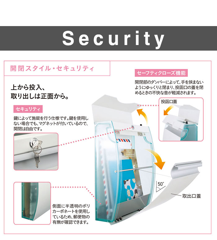 エントランスに、透明なアクセント透明感のあるポリカーボネートを本体部分に採用し、緩やかなカーブ形状の扉が包み込むようにフィットする独特のフォルム▼仕様上から投入、取り出しは正面から▼特徴ゆっくりと扉が閉まるダンパー機能など、デザインだけでなく細やかな工夫が施されています開閉部のダンパーによって、手を挟まないようにゆっくりと閉まり、投函口の蓋を閉める時の不快な音が軽減されますシリンダー錠タイプです▼サイズ[閉じたとき]W320×H410×D150(mm)[開いたとき]W320×H528×D350(mm)[投入口]W250×H30(mm)▼材質[本体]アルミ[側面パネル]ポリカーボネート ▼重量4.0 ▼付属品取付用スペーサー【商品配送時の注意点】こちらの商品は配送日時の指定ができません。