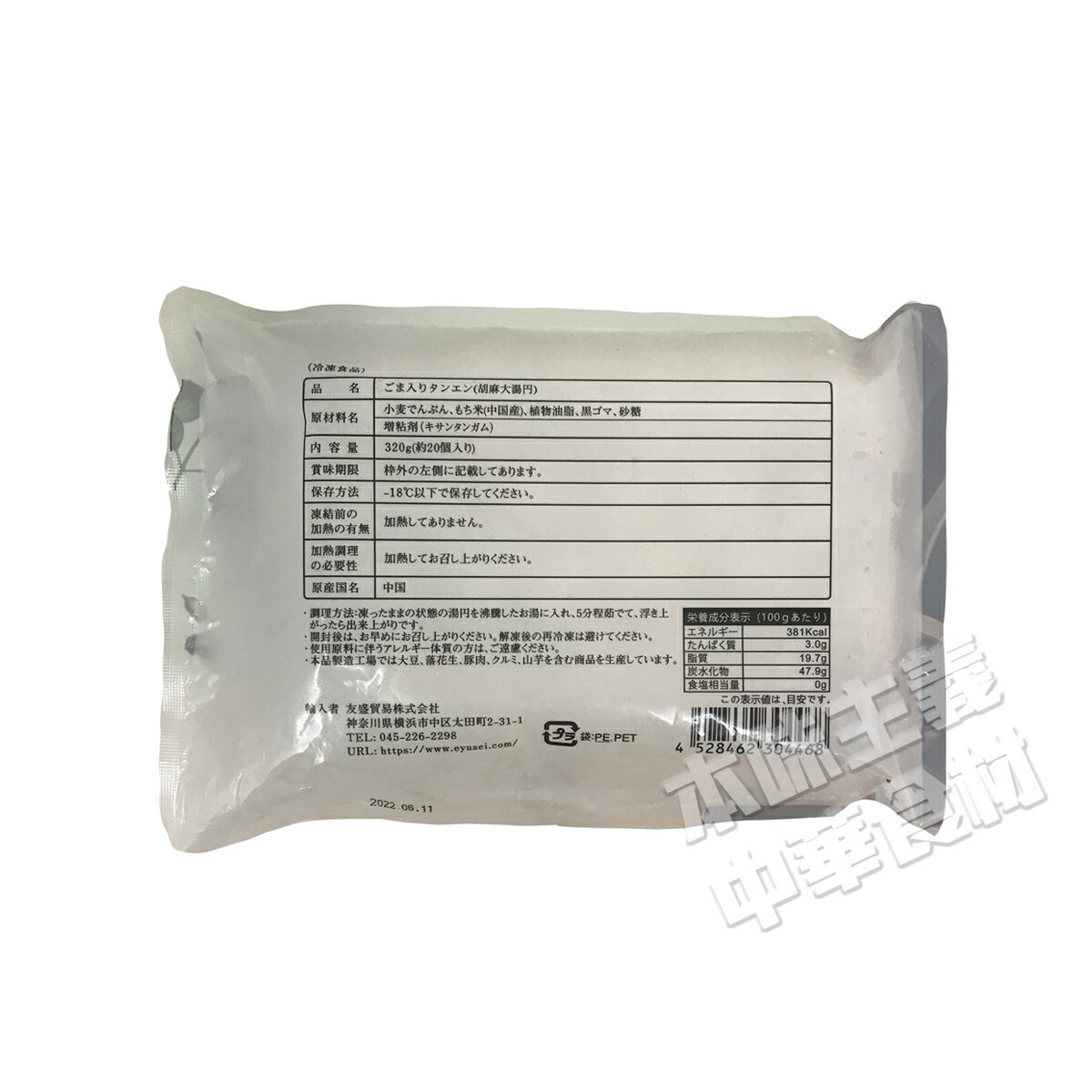 内容量 320g(約20個入り)/袋 ブランド 友盛 原産国 中国 特徴 白玉風のもちもちとした食感の球状の中にゴマ餡が入った中国の代表的なデザートです。